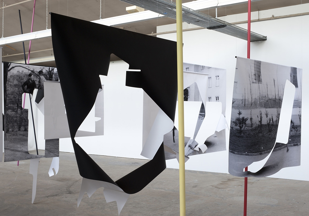 This series of installations focus on the sculptural qualities of the paper itself of the large reproductions of the photographic sources from which the play sculpture objects have been removed. The holes in the paper destabilize the sheets and the paper falls and folds into a 3-dimensional form. The layering forms a spatial collage that the viewer can enter. But the paper is fragile and the original bodily contact with the play sculpture is replaced by the caution one adopts when close to fragile material. The coloured tubes suggest a variety of possible colour codes and dimensions of the steel bars, which were often part of the original sculptures.